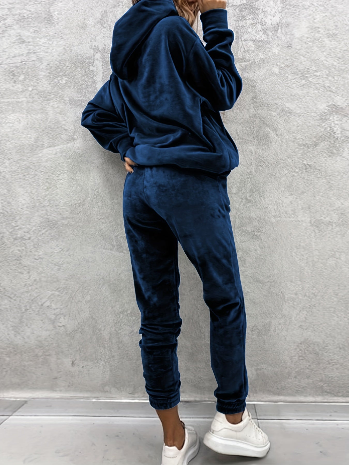 This matching set features a soft velour hoodie paired with relaxed-fit joggers, creating a comfortable and stylish everyday outfit. The hoodie includes a front pocket and a loose, easy-to-wear shape. The joggers have a fitted ankle cuff and a flexible waistband for extra comfort. The overall look is relaxed, modern, and perfect for daily use or casual outings.