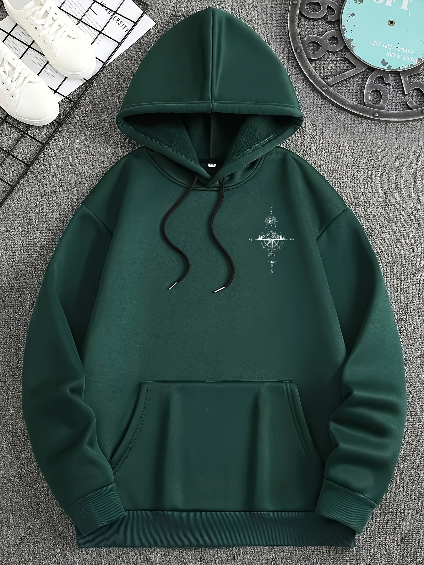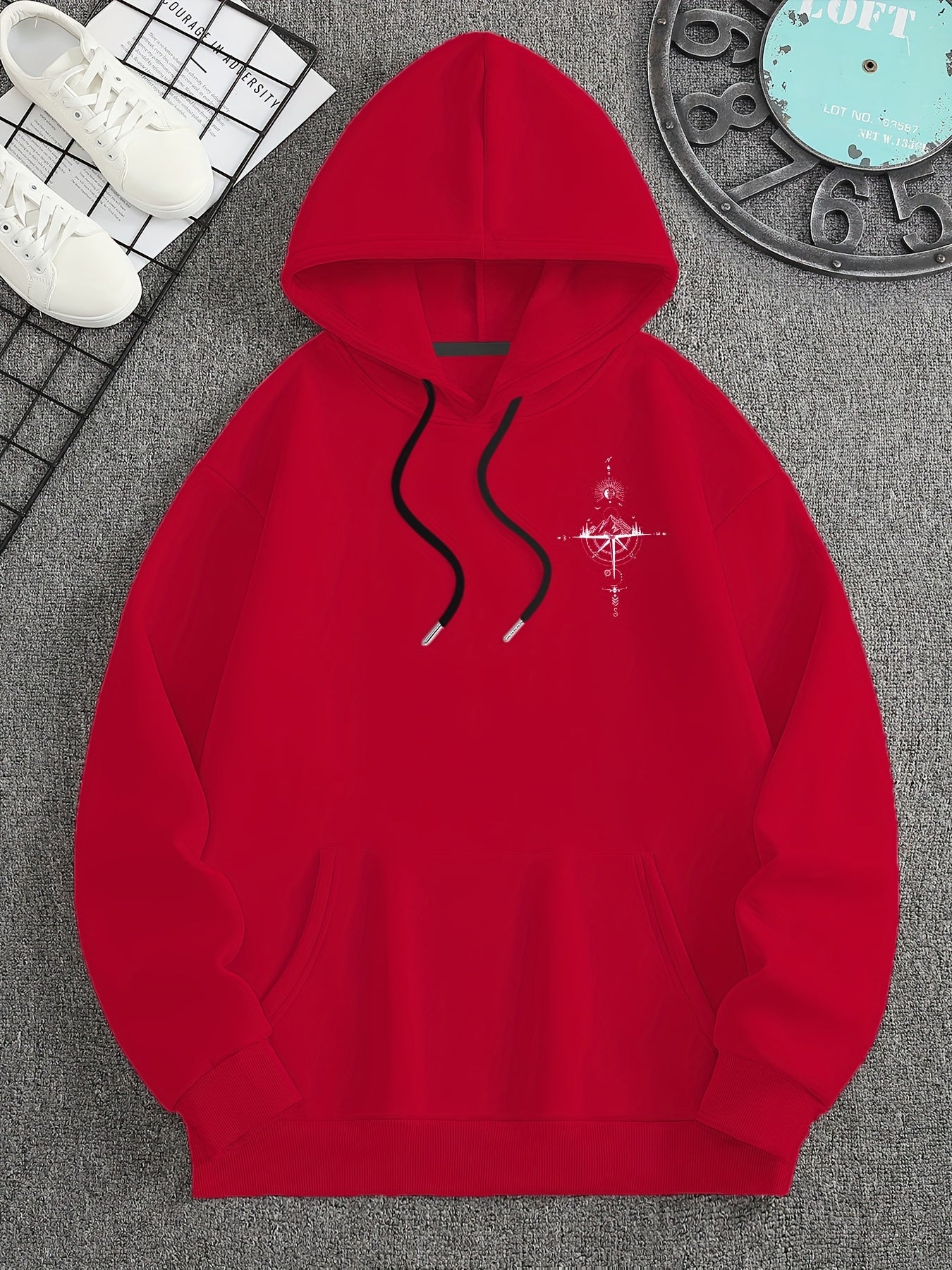 This hoodie features a clean, oversized shape with dropped shoulders for a relaxed, easy fit. The back displays a detailed graphic combining mountains, compass elements, and subtle outdoor symbols. The large hood adds extra comfort, while the smooth front keeps the look simple. Designed for casual days, it blends comfort and style with a laid-back outdoor feel.